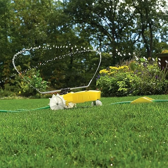 - Crafted From Durable: Crafted from cast iron, this yellow lawn sprinkler measures 20.13 inches in length, 9.38 inches in width, and 8.13 inches in height, with a substantial weight of 19.4 pounds