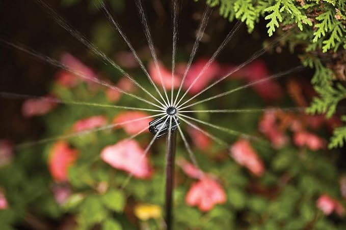 - Distributes fine water droplets in a 360° full circle pattern; adjustable from 0 to 10' spray distance