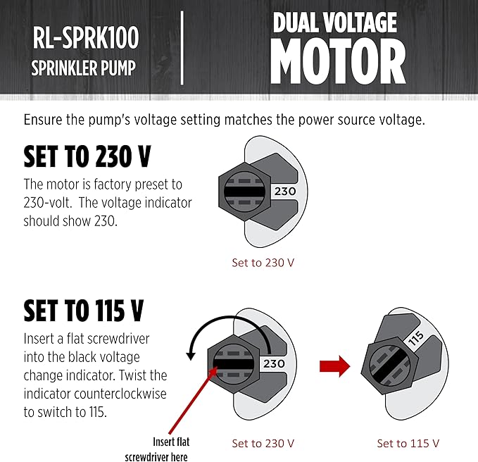 - DUAL VOLTAGE MOTOR: 115/230 Volts; pump is factory set at 230 Volts but can be easily switched to 115 Volts; always match the pump's voltage to the source voltage