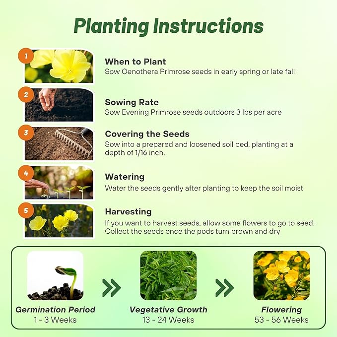 - Start Evening Primrose seed directly outdoors in either the fall or early spring. Prepare a seedbed that has had the top 2 inches loosened and is weed free. Cover lightly with 1/16 inch of soil. Keep the seed moist. With a temperature range of 65 – 70F, germination is usually in 30 days