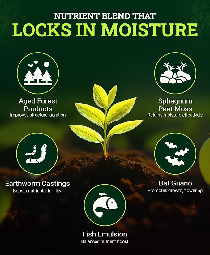 - MOISTURE-LOCKING NUTRIENT BLEND: This organic potting soil for plant is packed with aged forest products, sphagnum peat moss, earthworm castings, bat guano, and fish emulsion, each ingredient enhances moisture retention and nutrient uptake