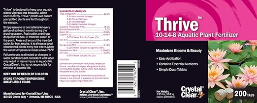 - Maximum Blooms & Beauty -- Thrive contains nutrients to keep aquatic plants growing vigorous leaves and beautiful blooms. Water gardening just got easier with fertilizer tabs for container plants.