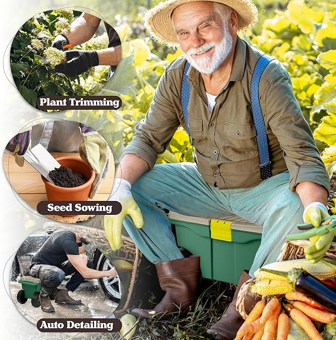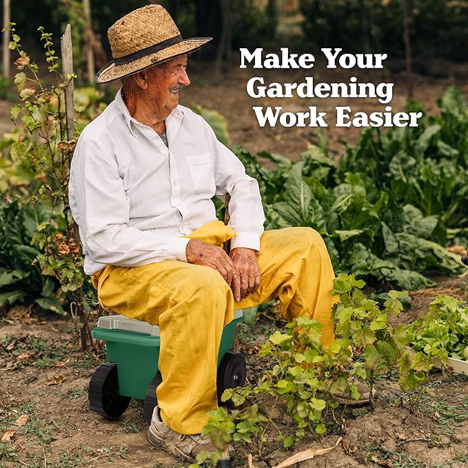 - ROLLING GARDEN CART WITH SEAT - This garden stool is ideal for anyone eager to ease back and knee pain when planting and weeding, as its lid offers a sturdy seat that makes low-to-the-ground tasks much easier, with less need for crouching and stooping.