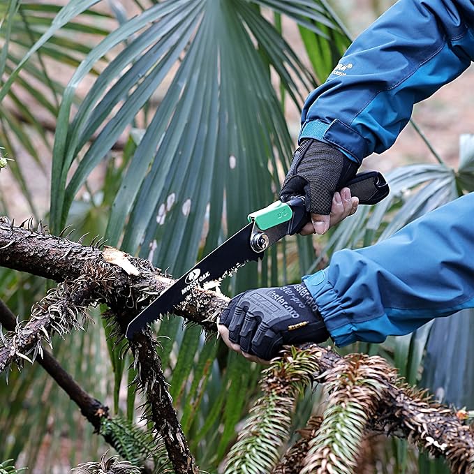 - SECURE LOCK - Tighten the black knob during use to prevent the blade upward or remove. Lock System prevents the blade from accidental close during use. Push the green button and fold the saw blade, store it in your pocket when it's idle. Before putting into use, take the folding saw out from the sheath, open and stretch the saw blade and lock it