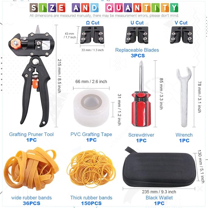 - ★ 1. What you get: Professional convenient grafting tool set including a dual-use grafting pruner tool contain 2 extra replaceable blades, a wrench and a screwdriver, along with 36pcs wide rubber bands, 150 thick rubber bands and 1 grafting tape, packed in a black wallet to meet all your needs