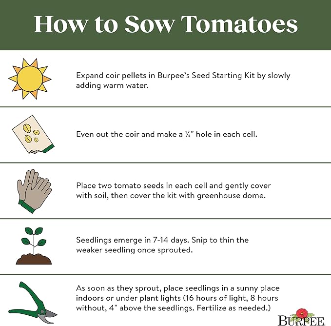 - SEED STARTING TIP: Sow tomato seeds indoors 6-8 weeks before average last frost. Harden off young tomato plants by leaving them outdoors in their containers up to a week before transplanting, after all danger of frost.