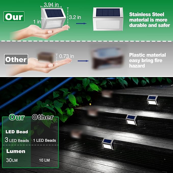 - High Efficiency Exterior Lights-Durable Use:The solar deck railing light's panel made of high quality monocrystalline silicon, conversion up to 18%, long lasting support to light up till dawn.3 LED beads are not too dark and not too bright,.The fence decoration light is not too harsh and will not affect your neighbors,enough for fence, deck railing, step, stairs, path, yard and garden, make your house more brighter and safer, don't worry about strangers approaching.