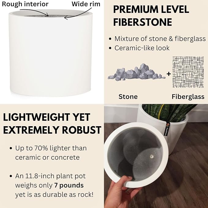 - LIGHTWEIGHT AND DURABLE FIBERSTONE – Up to 70% lighter than ceramic or concrete, this fiberstone 12 inch plant pot weighs only 7 pounds! Our planters are also frost and UV resistant, making them ideal for both outdoor and indoor use.