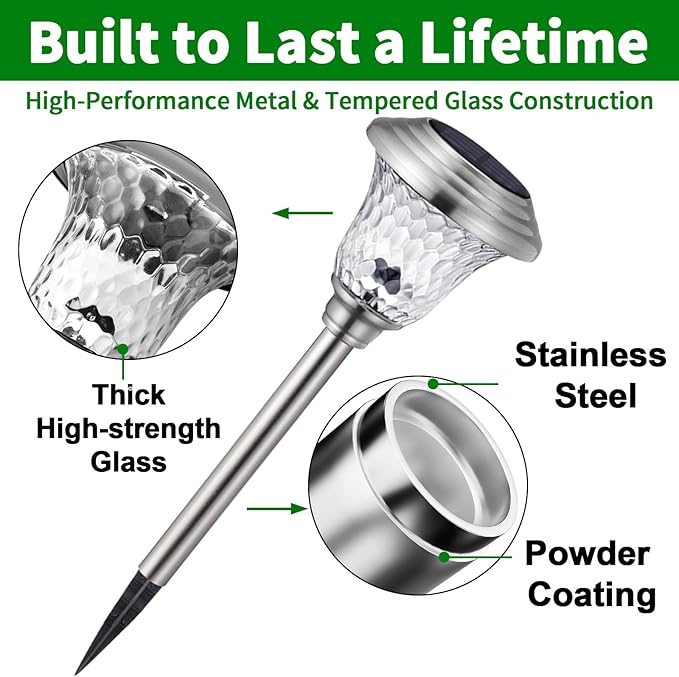 - SIZE & PREMIUM MATERIAL: 8 pack solar pathway lights measures 16.54" in height x 4.72" in diameter. Colored solar Pathway Light with auto sensor made of stainless steel with watertight diamond glass light shade that enables you to use this bright solar light durably. And glass lens is not prone to fogging or condensation buildup.Good glass lens resistant to cracking or breaking.Premium metal and glass of this solar pathway light outdoor for garden, lawn and backyard is much better than others.
