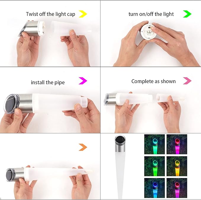 - ► 【Unique Lighting】-- 6 pack Decorative solar garden path lights have upgraded lighting effect design, 4 LED bulbs (2 white lights and 2 rgb lights) with 2 modes, white light and RGB color changing light, more brighter, more beautiful, light up your garden.