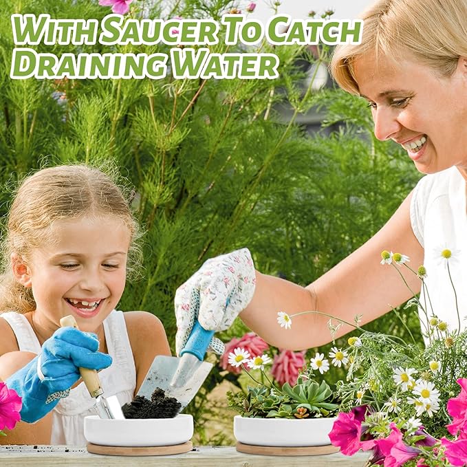 - Stylish & Functional Design: Crafted from high-quality white ceramic, these planters bring a sleek, modern touch to any décor. The bamboo trays add a natural, warm contrast while protecting your surfaces from water damage.