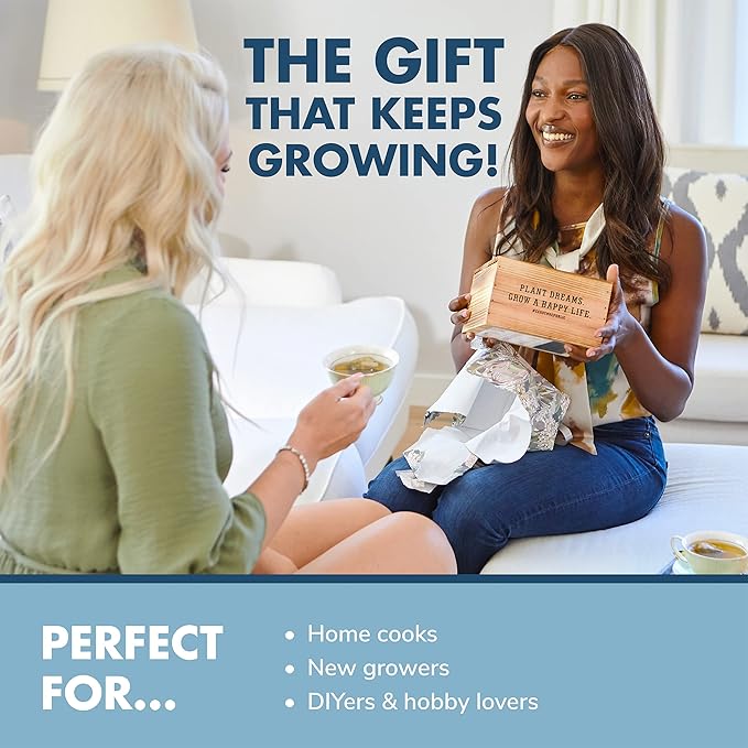 - WHAT’S INSIDE: 4 packets of non-GMO seeds, 4 soil disks, pruning shears, 4 burlap grow bags, 4 plant markers, and a wooden gift box that doubles as an indoor planter.