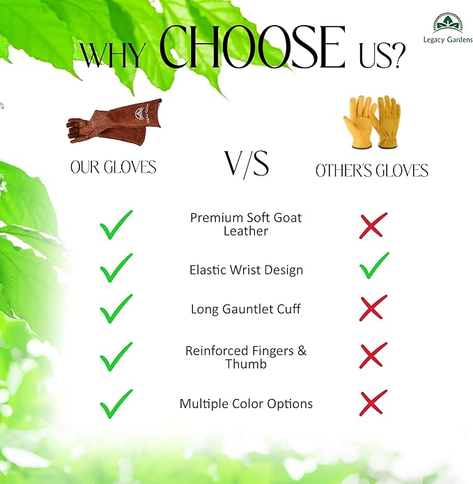 - BREATHABLE LEATHER FOR SOFTER HANDS - The A-grade goatskin leather these thorn proof garden gloves are made of was chosen specifically for its skin-sensitive properties. While lesser quality competing items use materials that cause sweating, discomfort and painful rubbing, our rose pruning gloves will keep your hands clean, healthy and soft to the touch.