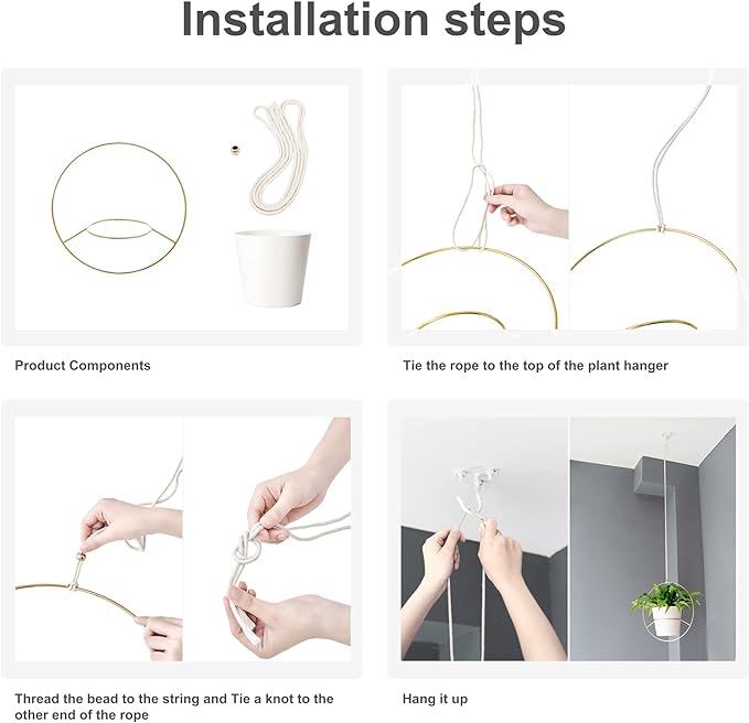 - Material: metal hanger, cotton rope and plastic planters. Suitable for indoor and outdoor use. Gold ring in diamond and circle shape match with round flower pot to brighten up the window, bedside, ceiling, livingroom, bedroom, kitchen in your home