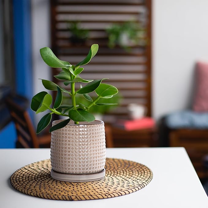 D'vine Dev 4 Inch Ceramic Beaded Stoneware Planter Pot - Flower Pot with Drainage Holes and Saucers for Indoor Succulent Plants or Flowers, Light Brown, 27-C-Z-4