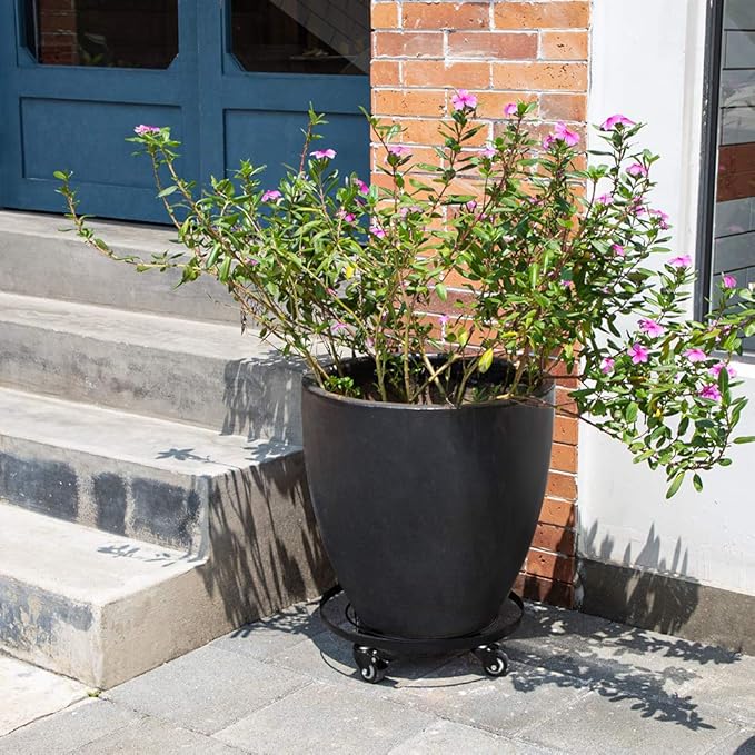 - Outdoor use rustproof & non-stuck on carpet: This heavy duty patio plant caddy with wheels is made of Black iron with vinyl PVC powder coated surface will enable you to use the Garden plant caster with wheels outdoors durably. The rolling plant stand with Black Fine surface will nicely compliment your patio, garden, yard or deck. Plant dolly or plant tray with wheels can be freely moved on house floor, even on the carpet, soil ground and lawn, and the wheels do not get stuck or locked up.