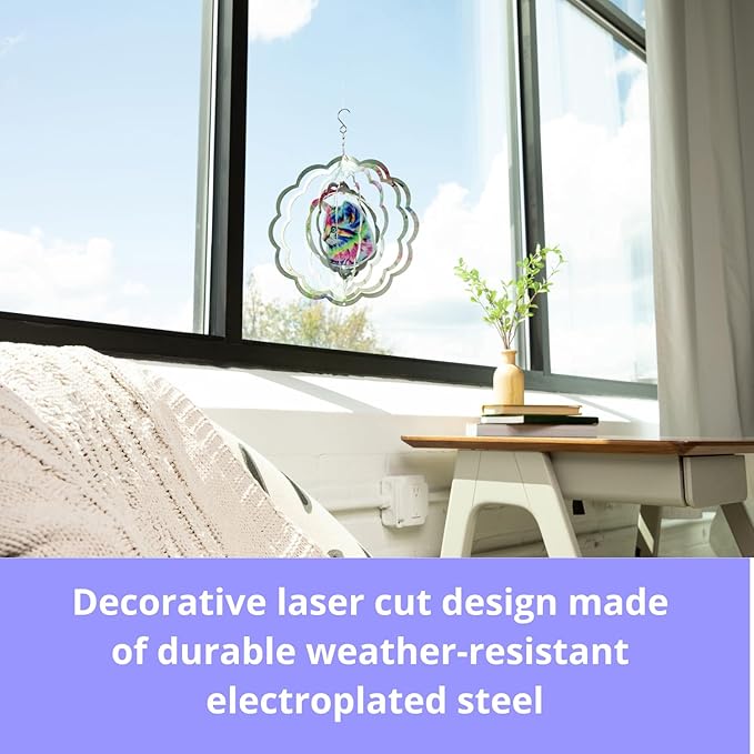- Durable and Mesmerizing: Crafted from sturdy, weather-resistant electroplated steel metal and adorned with a decorative laser-cut design, this wind spinner showcases mesmerizing patterns that captivate all who see it.
