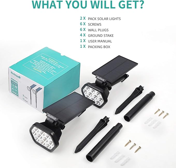 - More Resistant- IP66 WATERPROOF TECHNOLOGY: Through continuing to improve our technology and products, Nekteck 10 Led solar spotlights outdoor are made of high-quality plastic that allows them to withstand rain, snow, frost, or sleet; With an IP66 rating, Nekteck ensured that 10 Led solar landscape lighting long-lasting performance to light up your places all year round