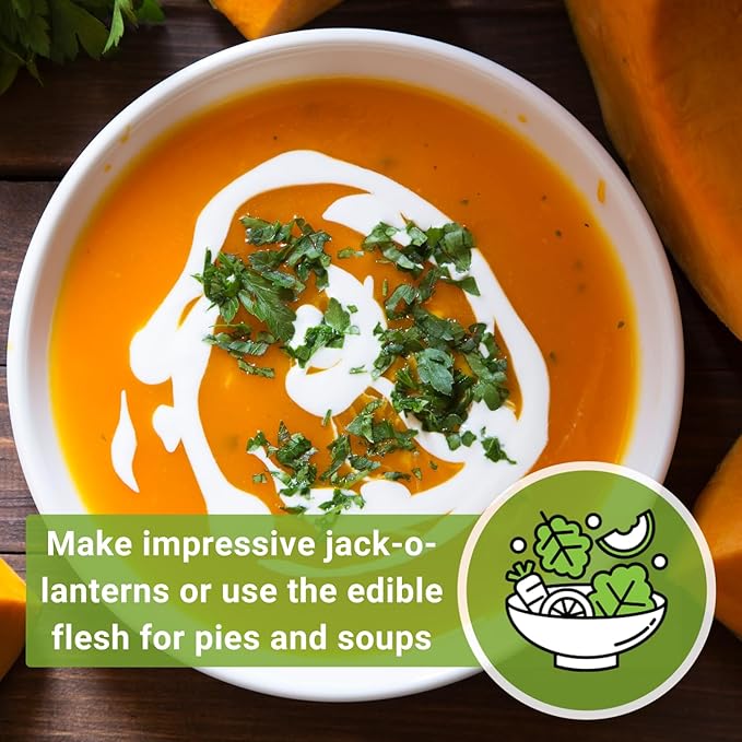 - Decorative or Eating - This fast growing pumpkin will amaze your children as they watch it grow. Plants have large green leaves and grow rapidly. Grow the largest pumpkin in your town and show it off to your neighbors. Pick when they are mid sized for jack o lantern carving! It also has firm sweet flesh that makes wonderful pies, breads, and even soups.