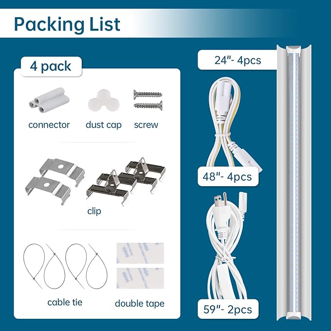 - What You Get: 4 x Barrina LED Grow lights, 2 x Power cords with ON/OFF switch, 3 x Connecting Cords(48''), 4 x Small Connectors, 8x Installation Clips, 8 x Double-sided tape, 16 x cable ties