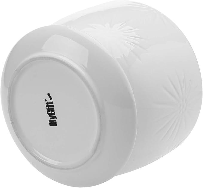 MyGift 7 Inch Round White Ceramic Plant Pot with Drainage Hole and Attached Saucer, Modern Decorative Embossed Sunburst Planter Container for Indoor Home Garden