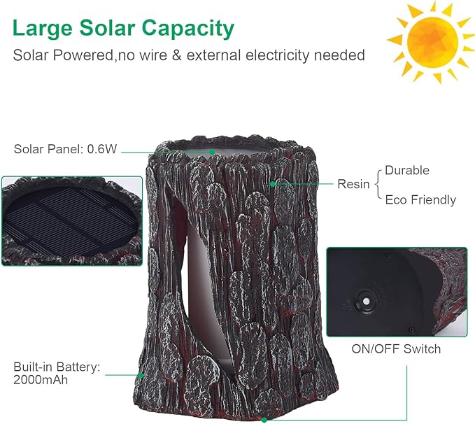 - 【NO INSTALL NEEDED】Just turn the switch on, put it under sunlight, the “Stump” will automatically on fire in the night