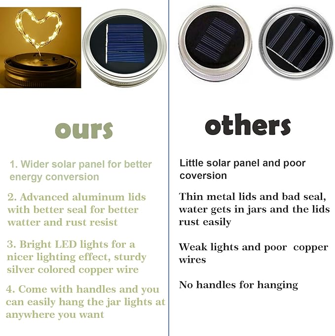 - High Quality & Romantic - Very popular Mason Jar string fairy firefly lights lids. Turn your discarded mason jars into beautiful lights to decorate your surroundings.Just put it on shelves,tables,porches, trees,patios and pergolas.A great gift family and friends who love decorating home