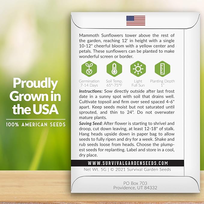 Survival Garden Seeds - Mammoth Sunflower Seed for Planting - Packet with Instructions to Plant and Grow Enormous Colorful Flowers in Your Home Flower or Vegetable Garden - Non-GMO Heirloom Variety