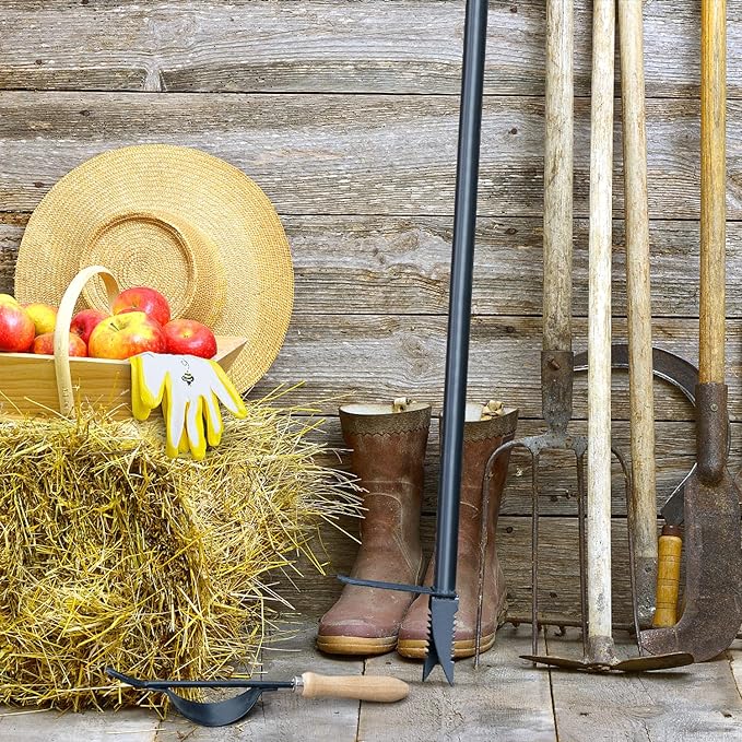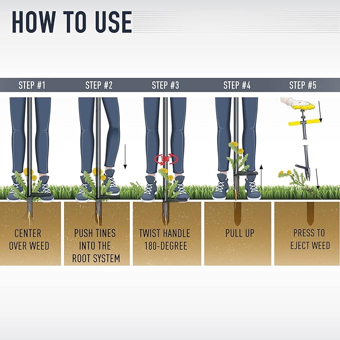 - EASY TO USE: Just keep you upright, center over weed, simply push prongs into the root system of a weed with your foot, rotate handle 180-degrees, and extract the weed, roots and all! Then simply push on the thumb release to pop the weed plug from the tines. This is great for composting and eliminates cleanup.