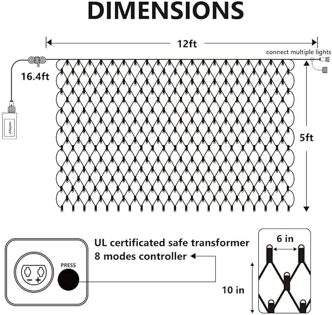 - Timer Function: Activate the timer by long pressing the button on the adaptor for 3 seconds until the timer indicator lights up. Timer keeps the Christmas net lights on for 6 hours and off for 18 hours, freeing your hands and saving energy.