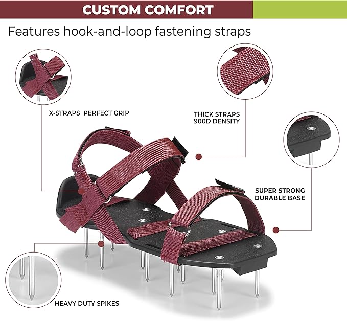 - FIT OF FASHION – Enjoy gardening shoes that are snug AND stylish! Your 1-size yard aerator features 3 maroon straps that complement your footwear and pull tight with hook-and-loop fasteners.