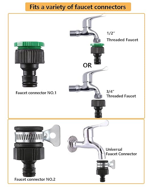 - 【Applicable Faucet】The faucet connectors can be converted, not only fit for 1/2” and 3/4“ threaded faucets but also fit for non-threaded faucets, just simple installation can start watering the plants right away without any skills of digging or plumbing.