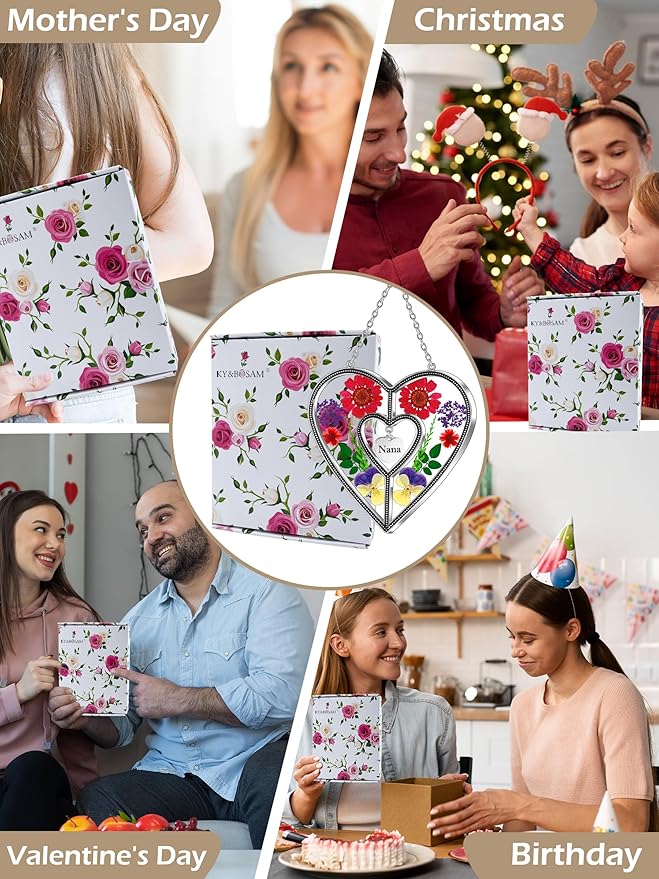 - ❤ Detail: The frame of the Stained Glass Heart suncatcher is made of electroplated silver & zinc alloy Glass, Real flower material, which is firm and textured, really dried flowers pressed between glass heart, The dried pressed flowers are adopted from nature, so that would be slightly different for each one, one of the pendants has a heart-shaped tag hanging on it, which is engraved with "Nana", it's a nice gift to express your love to your grandma;
