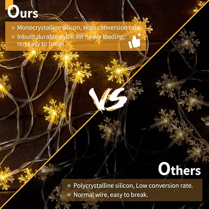 - 【Efficient Solar Snowflake String Lights】The solar Christmas lights equipped sophisticated and 180 degree adjustable monocrystalline silicon solar panel with inbuilt 800mAh rechargeable battery; When the built in NiMH battery saves enough solar energy in the daytime, the string lights can automatically work for 8 to 10 hours at night, no extra utility electric cost.
