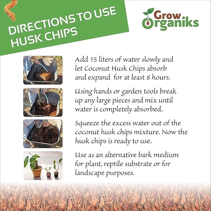 - [🐍100% Natural & Biodegradable] Grow Organiks Coconut Husk chips are cut pieces of the husk of the coconut compressed into 11 lbs.Coconut husks are a sustainable alternative to other mulches. Our Organic coco chips are best suitable for growing plants, and also perfect for reptile substrate.