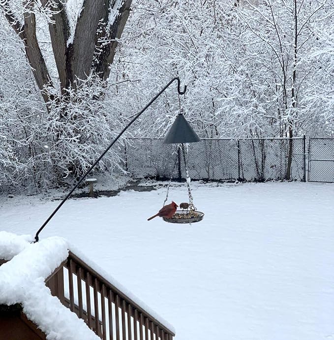 - Deck Hook Smart Design:43-inch bird feeder pole, a longer distance guard against squirrels. Things like bird droppings and seeds all fall off the deck, making it easier for you to clean up.