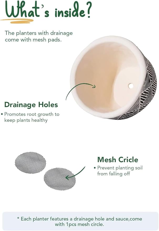- Drainage Holes, Saucers and Mesh Nets: These indoor plant pots aren’t just stylish; they're practical too; With built-in drainage holes and mesh pads, excess water escapes while retaining soil, ensuring your plants thrive; The attached drip pans prevent mess, keeping your floors pristine
