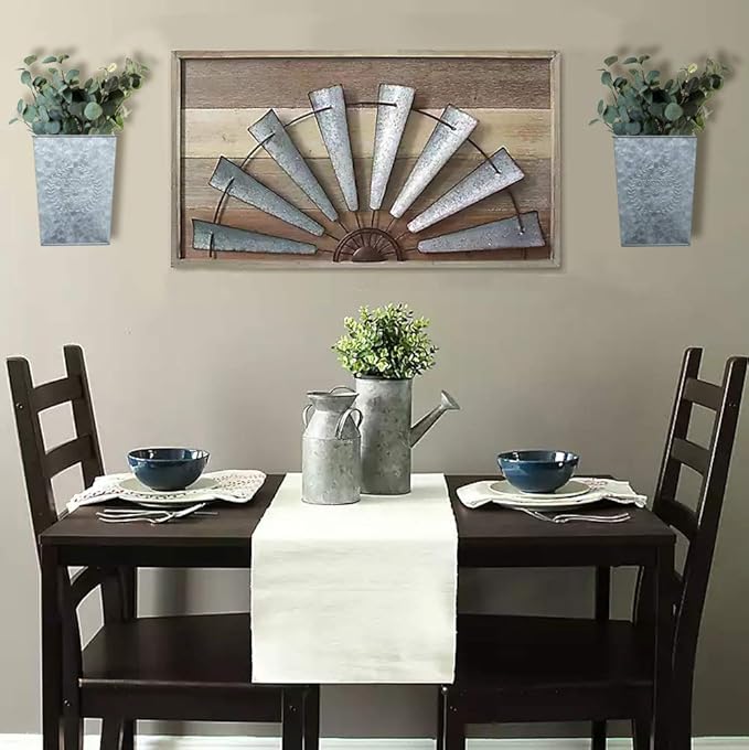 - ✅METAL TIN WALL VASE:Farmhouse wall decor style hanging wall planters are made of high quality metal features an antique finish.Farmhouse wall planter, use to accent other pieces in homes such as the rustic style of a wall clock or wooden plaque.Galvanized wall decor is sure to make the perfect gorgeous rustic decoration addition to any room in your home,deck,or garden or indoors in your kitchen,living room, bedroom, dining room, or bathroom. Suitable for indoor and outdoor use.