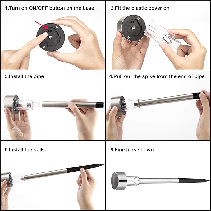 - [EASY INSTALLATION]: No tools and external wires. Put together each part of the solar garden light, and then push the stake into the soft soil. If the soil is quite solid, we recommended you make a hole on the ground before inserting the stake