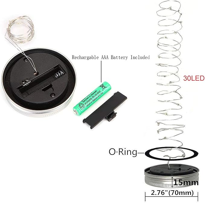 - ♔SPECIFICATIONS: Gorgeous copper wire with 30 bright bulbs can make your surrounding pretty romantic.Fits for most regular mouth mason canning jars, lid diameter size: 2.76 inches (70 mm) / insert 2.17 inches (55 mm).