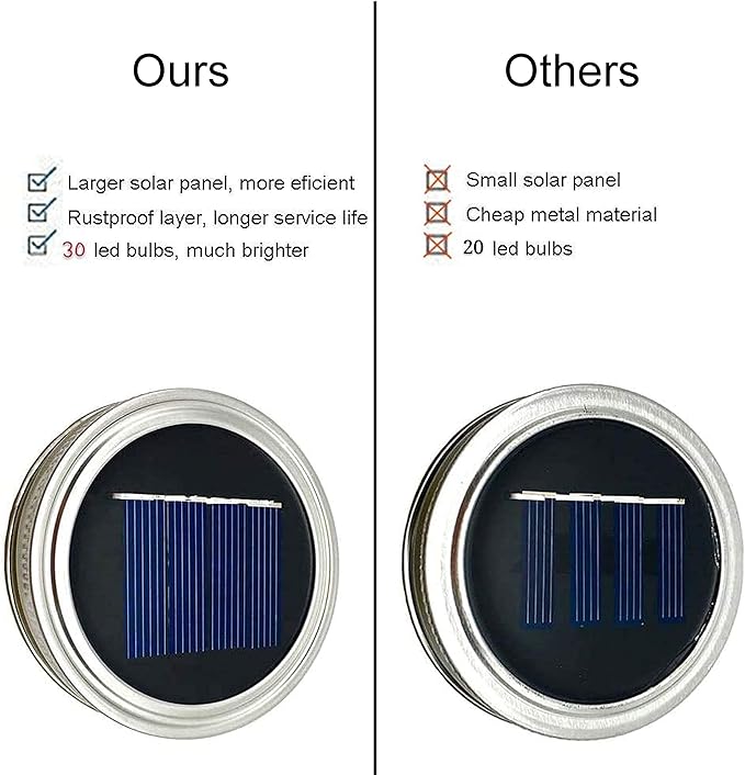 - ♔UPGRADED MASON JAR LID LIGHTS: With 30 micro LED, much brighter than those 20 LED jar lights. Larger solar panel, charge more efficiently. The edge of the lid uses rustproof material instead of cheap alloy, you would find it more durable in humid weather.