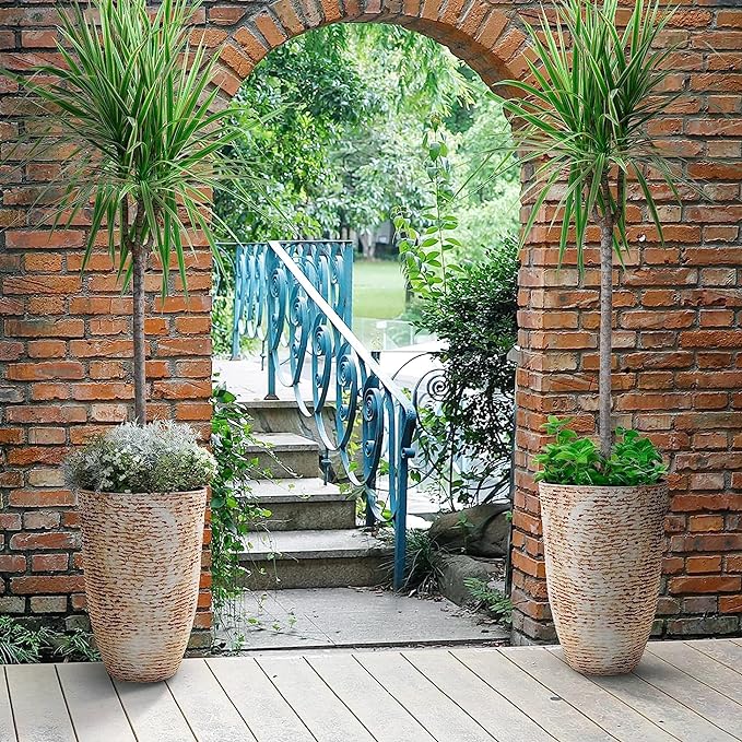 - Classic Appearance: Its curved silhouette and raised details offer up a touch of classic character, while a solid matte finish with grain texture updates the look; These tall tree planter is an ideal for a patio accent or flanked along an entrance wall; Gives your tall plants a tall planter! Size:14'' (Dia.) x 20.5'' (H.)