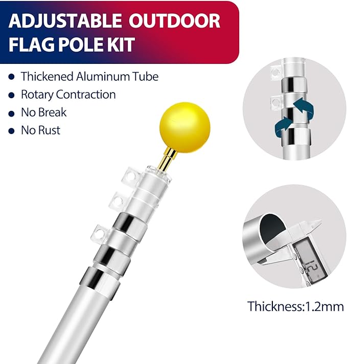 - PREMIUM MATERIAL- Our telescopic flag pole is made of premium aluminum material to offer an excellent performance in anti-rust and anti-corrosion, the flag pole for outside in ground is designed to meet any bad outdoor environments like snowy and heavy rainy, built to last.