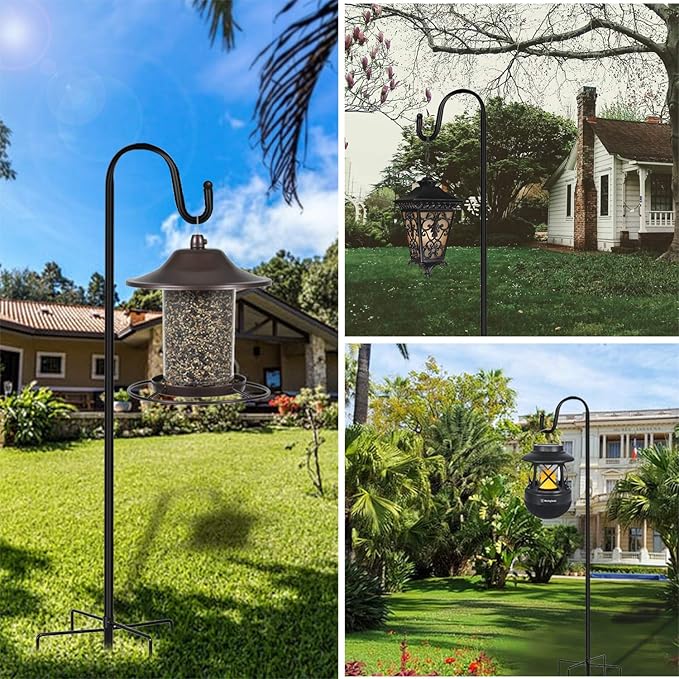 - 【Stability】Compared to other similar hooks in the market, our heavy duty shepherd's hooks have upgraded with 4 extra-long and double-forked base prongs to be total 5 prongs which makes it the strongest garden hook in the market and maintain a fixed, upright posture while remaining firmly planted in the ground without easily falling.