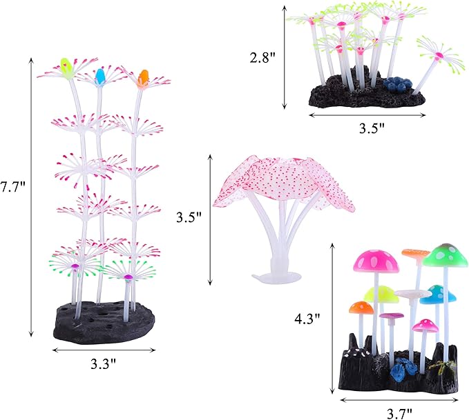 - 【Unique Design】4 pieces aquarium decor: 1 x Branch Coral, 1 x Coral Reef, 1 x Anemone and 1 x Mushroom. Size: The mushroom Height 11cm, The anemone Height 9cm, The Coral Reef 9*5.5cm, Total Height 7cm, The Branch Coral 8.5*5.5cm, Total Height 19.5cm.