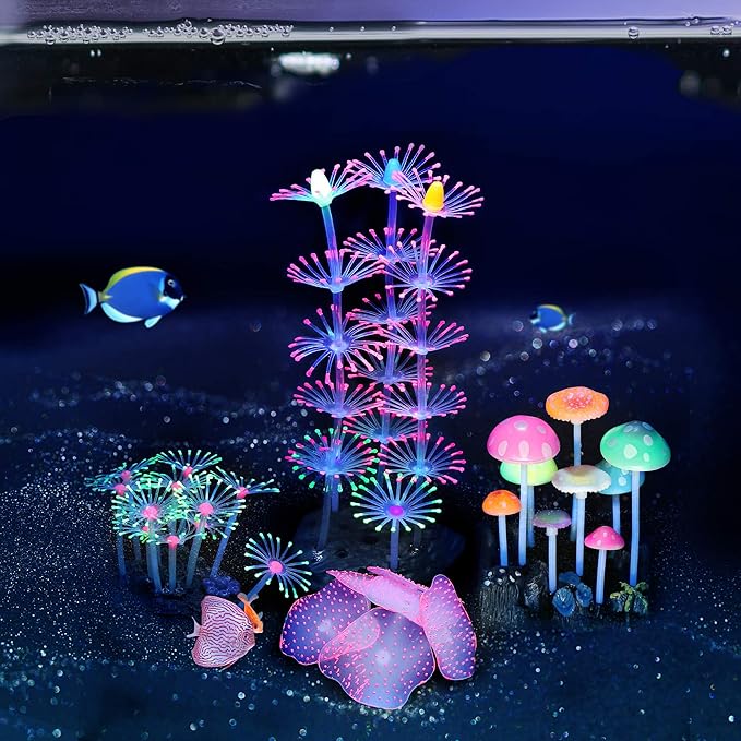Lpraer 4 Pack Glow Aquarium Decorations Coral Reef Glowing Mushroom Anemone Simulation Glow Plant Glowing Effect Silicone for Fish Tank Decorations