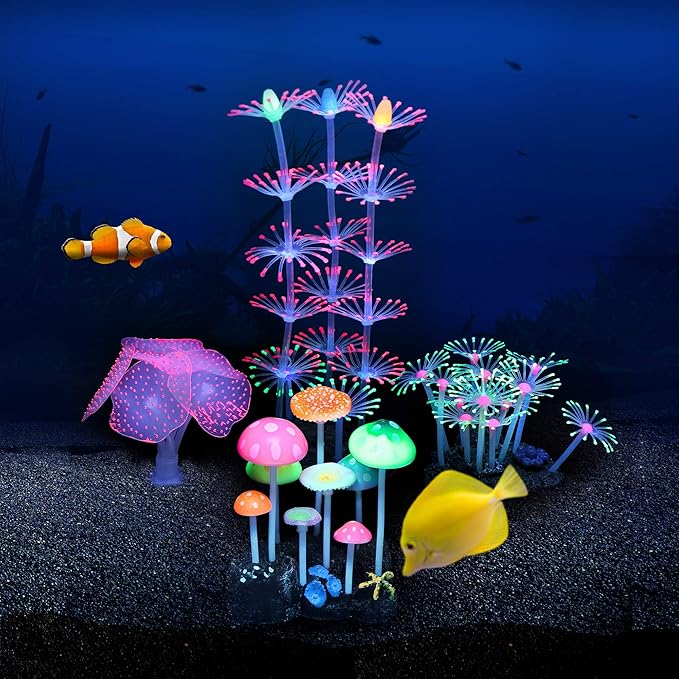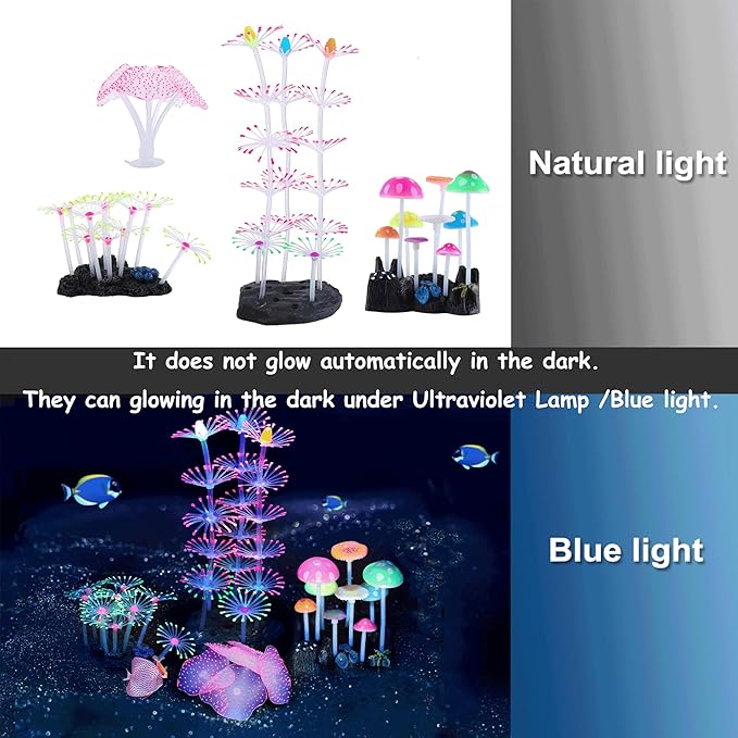 - 【Glowing In The Fish Tank】The glowing effect of these glow aquarium decorations will only happen to acted lighting, not "Glowing in the dark!". The ornament does not glow automatically in the dark. They can glowing in the dark under Ultraviolet Lamp /Blue light. Make sure you rinse it off before place it in your tank. Create a beautiful and mysterious under water world. Perfectly matched your aquarium and other fish tank.