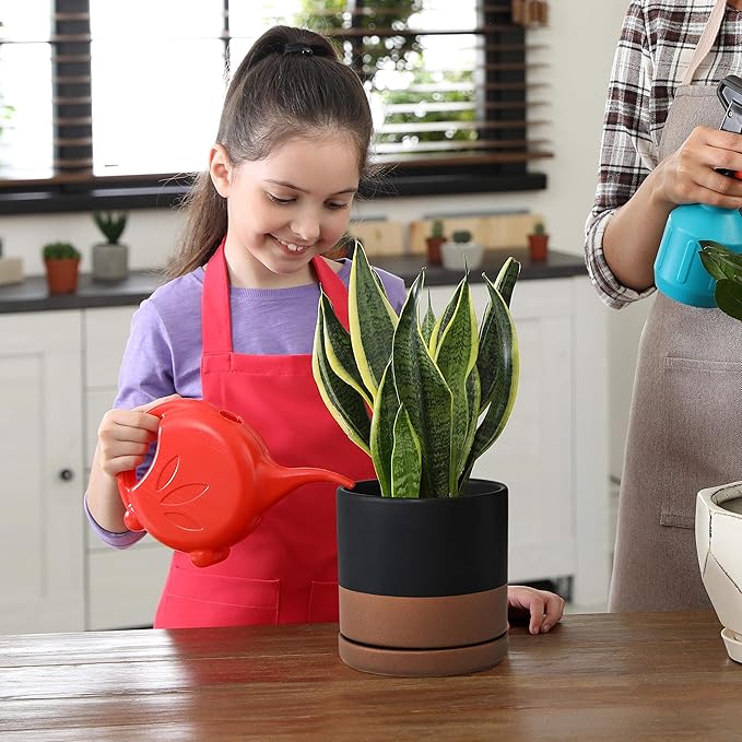 D'vine Dev Set of 2 Plants Pots, 6 Inch Ceramic Planter Pot for Plants with Drainage Hole and Saucer, Black/Speckled Tan, 94-V-C-7
