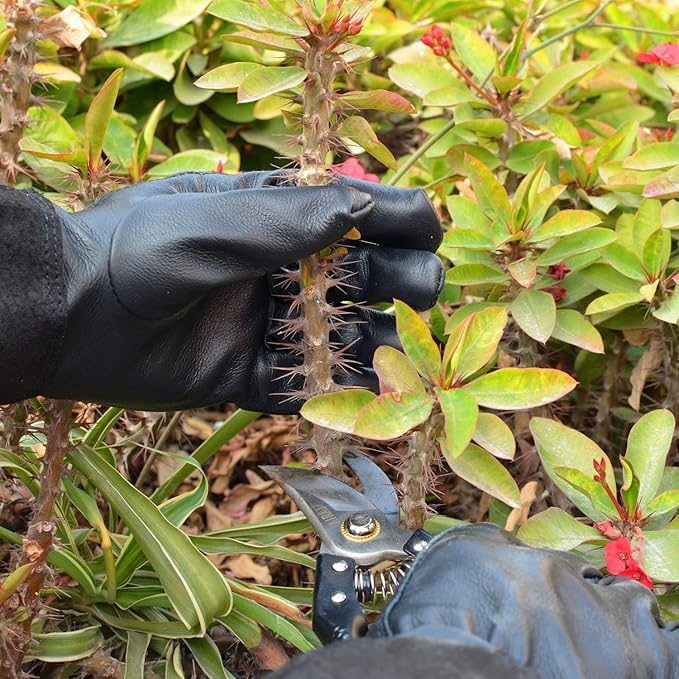 - Heavy Duty Leather Garden Gloves: Genuine leather gloves is thron resistant that will protect your hands safe from rose thorns, thistles, brier plants and so on. Professional gardening gloves for rose pruning and cactus trimming