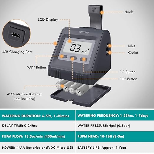 - SPECIFICATIONS: Max water 10 pots of indoor plants simultaneously. Pump flow is 13.5oz/min (400ml/min). Pump head can reach max. 16ft. Water pressure is max. 4psi. It can be powered by 5VDC micro-USB cable (not included) or 4*AA 1.5V batteries (not included). The batteries can run this waterer device for over 1 year. The pump timer can also be easily hooked on a bucket with the included clamp which adds more convenience